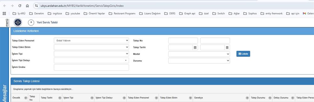 2.Açılan ekrandan Yeni Servis Talebi butonu tıklanılır.